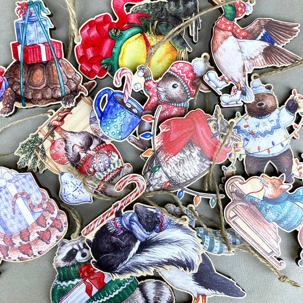 This wooden ornament of a scarf-wearing skunk holding a candy cane staff will be a festive and fun addition to your customers' holiday ornaments. Hanging on a jute twine cord, this ornament is beautifully printed on the front, stamped logo on the back, and is laser cut on responsibly sourced wood. The ornament is 4mm thick and measures 3 x 2.7 inches.