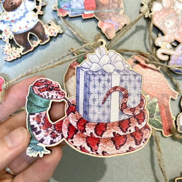 This wooden ornament of a snake wrapped around a present will be a festive and fun addition to your customers' holiday ornaments. Hanging on a jute twine cord, this ornament is beautifully printed on the front, stamped logo on the back, and is laser cut on responsibly sourced wood. The ornament is 4mm thick and measures 3 x 2.75 inches.
