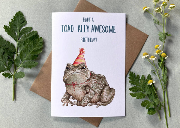 5x7 inch birthday card featuring a very grumpy toad, saying "Have a Toad-ally Awesome Birthday!" The card is a thick, matte 100lb paper (thicker than cardstock) made from FSC certified, 100% recycled post-consumer waste. The envelope is made from 100% recycled material. It is protected by a compostable "plastic" sleeve made from PLA (that's plant based!).